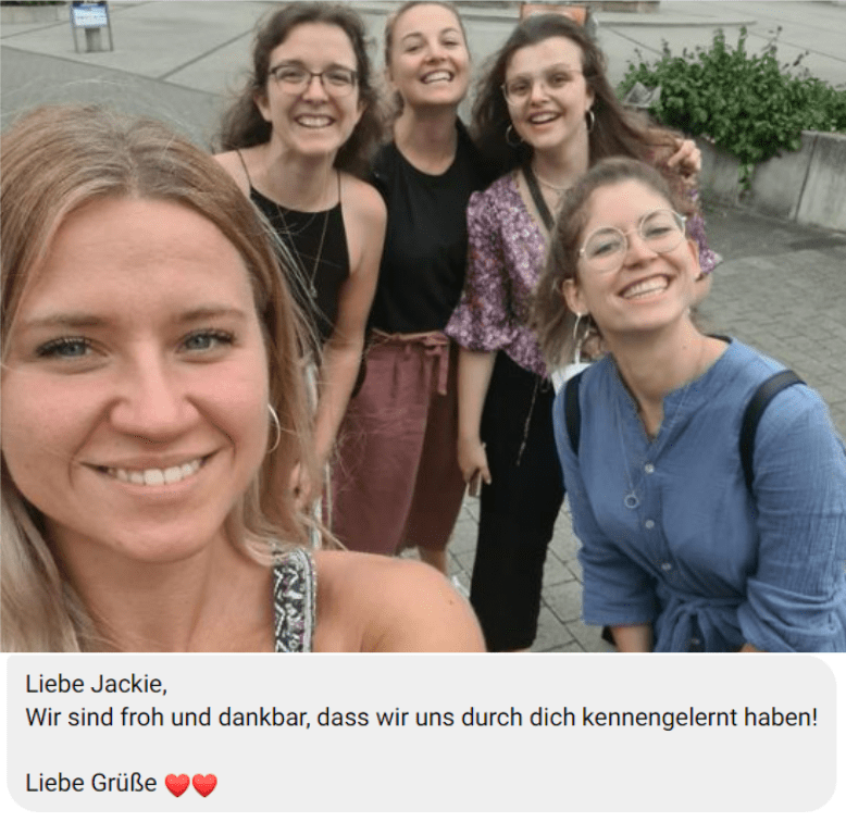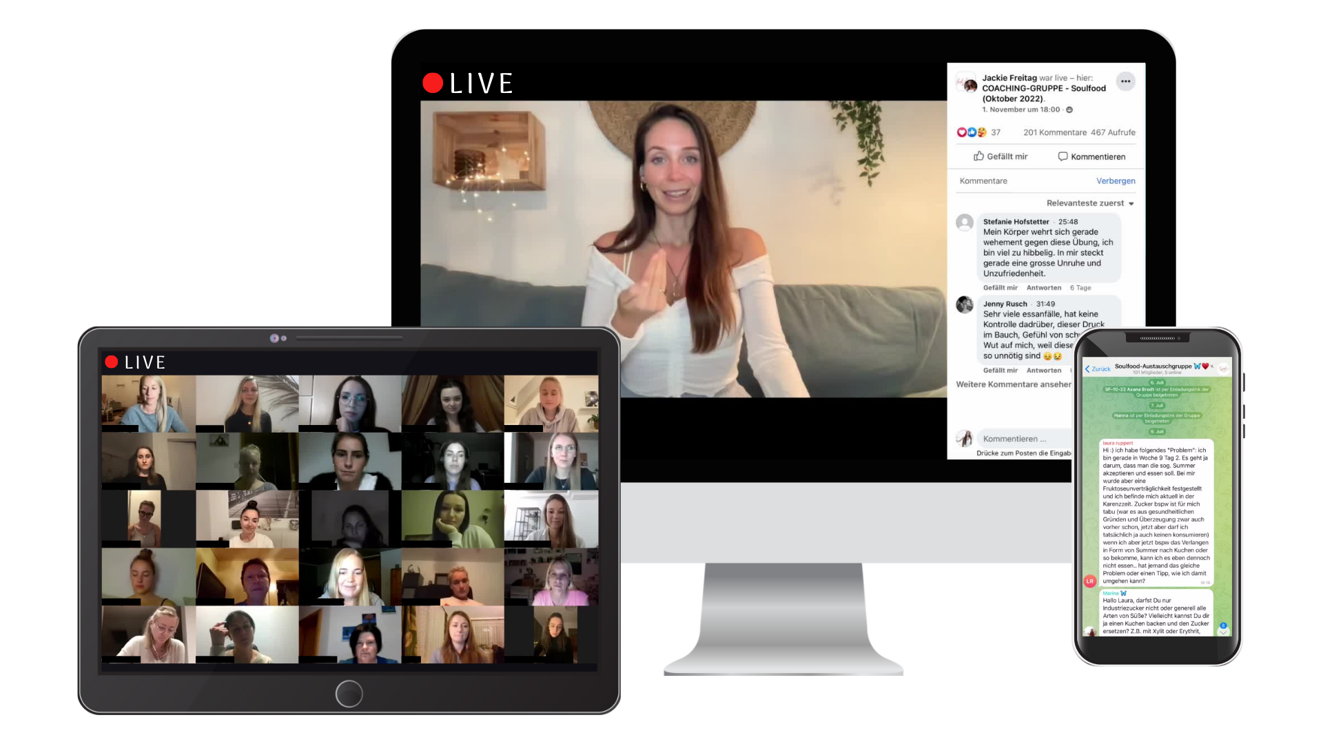 Neben dem Online-Kurs starten wir mehrmals im Jahr gemeinsam in der Gruppe. Hier erwarten dich neben dem täglichen Austausch mit den anderen Teilnehmern zusätzlich wöchentliche LIVE-Online-Seminare mit Jackie persönlich sowie LIVE-Gruppen-Calls mit den Coaches aus unserem Team.